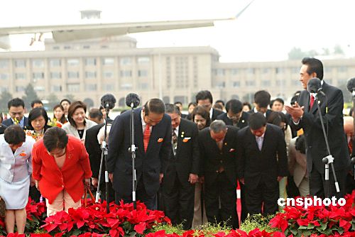 五月十三日上午,親民黨主席宋楚瑜結(jié)束了九天八夜的大陸之行離開北京,在發(fā)表臨行感言后帶領(lǐng)全體親民黨大陸訪問(wèn)團(tuán)團(tuán)員鞠躬致謝。作者:廖文靜