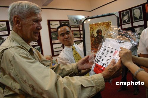飛虎隊(duì)展覽館工作人員向愛德華·康姆亞蒂(左)贈(zèng)送陳納德將軍畫像和二戰(zhàn)期間美國飛行員必備的印有“來華助戰(zhàn)洋人(美國)軍民一體救護(hù)”的“救命服”