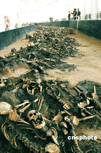 如今,在慘案現(xiàn)場建立的“平頂山慘案紀(jì)念館”內(nèi),已經(jīng)實(shí)地挖掘出八百多具遇難同胞的骨骸。那是一幅無法想象的悲慘景象:燒焦的木頭,干癟的汽油桶,層層疊疊的尸骨,尸骨上還清晰可見深深的彈孔和刀痕。從一具具保持著匍匐爬行姿勢的遺骨,完全可以想象出遇難同胞臨死前的頑強(qiáng)與悲憤。最令人悲痛震撼的是一具懷著胎兒的母親骨骸,依稀可見小生命在母親腹中掙扎的慘狀。而在這具孕婦尸骨旁邊,竟還有一具襁褓中的嬰兒骨骸,一個出生不久的小生命竟遭受如此殘害毀滅,可見屠殺者的喪心病狂與無比殘暴。