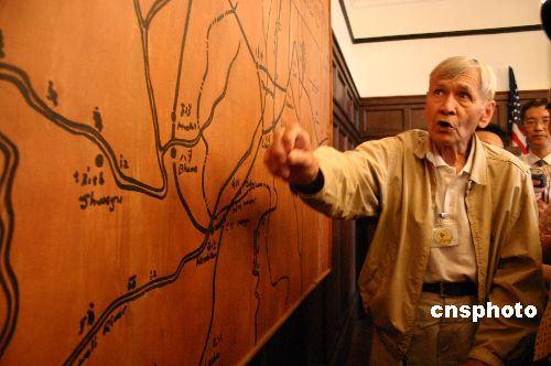 在史迪威將軍博物館里,愛德華老人在史迪威將軍昔日的軍事會議廳里,面對一九四四年繪制的“史迪威公路全圖”,他清楚地描述著當(dāng)年駝峰飛行的路線。