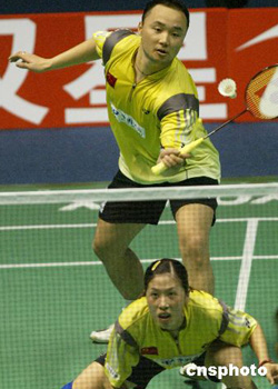 雅典奧運(yùn)冠軍張軍/高崚率先登場(chǎng),迎戰(zhàn)韓國強(qiáng)力搭檔李在珍/李孝珍。中國組合開局階段忌憚李在珍的強(qiáng)力殺球,回球過于集中在網(wǎng)前,身材高大的李孝珍網(wǎng)前如魚得水,攻擊連連得手。在四比十一落后的困境中,中國球員調(diào)整戰(zhàn)術(shù),加強(qiáng)球路變化,搶回場(chǎng)上主動(dòng)權(quán),一口氣連奪十一分,先勝一局。易地再戰(zhàn),中國球員故態(tài)復(fù)萌,再度陷入被動(dòng),中局他們雖一度占據(jù)場(chǎng)上優(yōu)勢(shì),但最后階段莫名其妙的失誤使他們以十一比十五輸?shù)粢痪。決勝局,中國球員發(fā)揮比較穩(wěn)定,比分一路領(lǐng)先,以十五比八為中國隊(duì)打響頭炮。