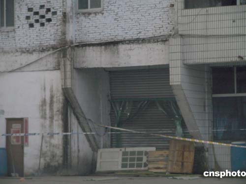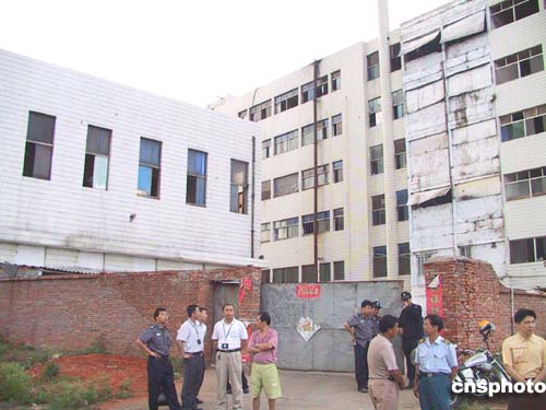 工廠由兩幢半拉子樓組成,樓房顯得很陳舊,一些窗戶甚至沒有玻璃,黑洞洞地呲著嘴。正對院門的大樓據(jù)說是生產(chǎn)車間,高六層。大樓中間是電梯井房,但沒有安裝電梯。廢棄的電梯井房便被工廠當作生產(chǎn)浸泡水池。一樓電梯井口的鐵制卷閘門被嚴密地拉下,前面還擋了一塊門板和一條警戒線。