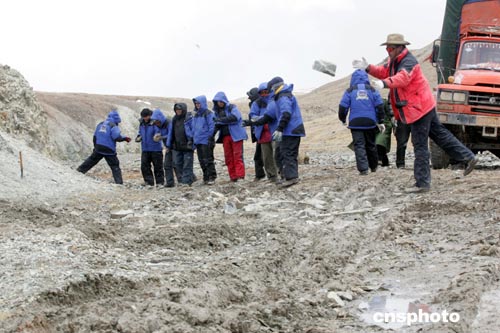 二零零五年五月十三日,穿越可可西里聯(lián)想鋒行探險(xiǎn)隊(duì)傳遞石頭,為陷車的八噸大卡墊路。