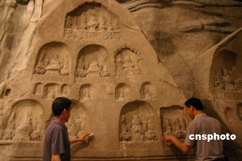 五月十八日,重慶中國(guó)三峽博物館正在為開館緊張準(zhǔn)備。兩名工匠正清潔“龍灘河摩崖造像”。“龍灘河摩崖造像”是三峽博物館內(nèi)最“重量級(jí)”的文物,其重量超過(guò)三十噸,由兩塊整體切割的造像巖石組成。三峽蓄水達(dá)到一百三十五米時(shí),“龍灘河摩崖造像”就被淹沒,早前當(dāng)?shù)匚奈锊块T用了近兩個(gè)月時(shí)間,將造像完整切割。重慶中國(guó)三峽博物館于二○○二年十月二十八日開工,將于今年六月十八日正式開館,預(yù)計(jì)將展出文物八千到一萬(wàn)件,可入藏三十萬(wàn)件文物,主要收藏重慶及三峽地區(qū)文物。作者:郭晉嘉