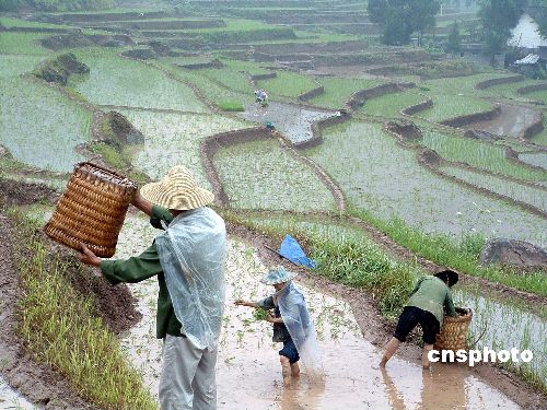 5月20日,重慶市云陽縣紅獅鎮(zhèn)中心壩田園,當(dāng)?shù)厝罕娬诿坝瓴逖。眼下,正值三峽庫區(qū)農(nóng)村“雙搶”(大春搶種搶收)季節(jié),一年一度的水稻栽插處在節(jié)骨眼上。但2005年的三峽梅雨季節(jié)比常年來得早,半月前便呈現(xiàn)三天兩頭雨的“孩兒臉”氣候。為了不誤農(nóng)時(shí),峽江兩岸農(nóng)村處處可見村民斗雨整田插秧的大忙景象。據(jù)了解,早到的多雨天氣對(duì)中高山及時(shí)出苗十分有利,但雨水也對(duì)秧苗固窩、勞作出行造成影響。雖然天公喜怒無常、冷熱頻換,人們對(duì)搶抓糧食生產(chǎn)的熱情不減。作者:饒國君