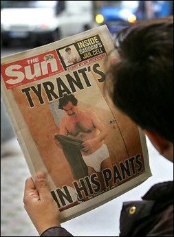 一男子在倫敦街頭閱讀太陽(yáng)報(bào),該報(bào)當(dāng)天頭版刊登了薩達(dá)姆獄中照片。美軍正在追查這些照片是何人拍攝的。(春風(fēng))