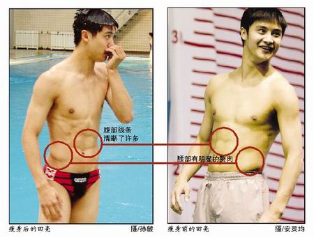 現(xiàn)在的田亮跟三月份不同,原有些模糊的腹部曲線清晰了很多,側面的肌肉更加緊湊,整個人也越發(fā)輕盈了,連他自己都贊嘆這是“苦練的結果”。