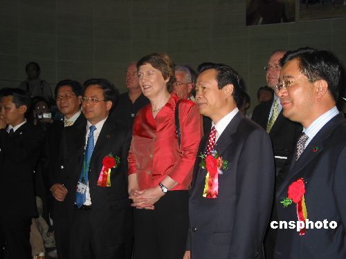 新西蘭總理海蓮·克拉克一行四日上午來到愛知世博會中國館參觀,并興致勃勃地為當天在這里開幕的海南周剪彩。圖為克拉克(右三)在海南省副省長陳成(右二)、中國館館長孫鋼(右四)的陪同下饒有興趣地參觀了當天洋溢著濃郁熱帶風情的中國館。作者:王健