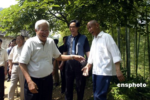 六月四日,全國政協(xié)副主席、全國政協(xié)副主席、中國致公黨中央主席羅豪才,率領(lǐng)致公黨中央的部分領(lǐng)導(dǎo)和一大批專家學(xué)者、實業(yè)家,由中共中央統(tǒng)戰(zhàn)部副部長黃躍金以及當(dāng)?shù)仡I(lǐng)導(dǎo)的陪同下,到安徽省安慶市潛山縣茶莊村進行大別山區(qū)扶貧調(diào)研。圖為羅豪才(左)與當(dāng)?shù)卮迕裥φ劽撠氈赂灰约稗r(nóng)村果樹種植。作者:盛佳鵬