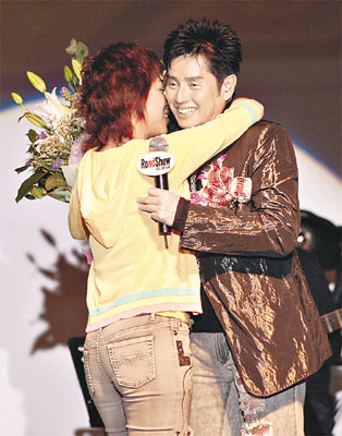 中新網(wǎng)6月7日電 據(jù)香港媒體報道,前晚在九展舉行音樂會,慶祝歌迷會成立二十五周年,除了香港fans外,還有來自內(nèi)地、臺灣、新加坡和日本等地過千的歌迷,他們送上球衣、字畫甚至火鍋醬料作禮物,有臺灣女fans更飛身擁抱吻了阿倫一啖,十分熱情。