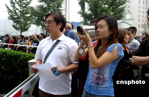 六月七日,二○○五年高考第一天,兩名人民大學新聞學院的學生在考場外紀錄北京高考。作者:張勤