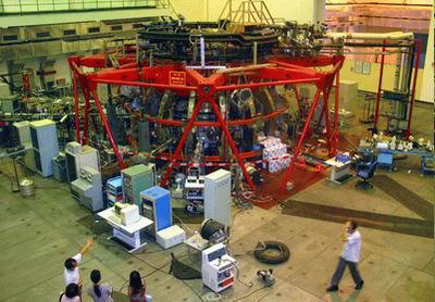 在參觀中,不時可以看到一些研究人員檢查著“人造太陽”的各個部件,還認真記錄下一組組數(shù)據(jù)!斑@個鐵疙瘩究竟如何產(chǎn)生能源呢?”對于我們的疑惑,研究人員解釋道:每1公升海水中就含有0.03克的氘,而這0.03克的氘在“人造太陽”這部裝置中可以產(chǎn)生相當于300公升汽油能量的聚變能量,而這個能量是可以轉(zhuǎn)化成電能使用的。