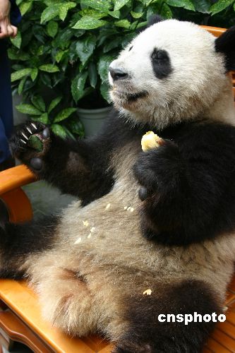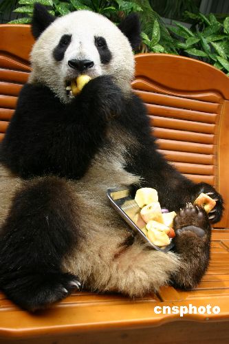 端午節(jié)將臨,6月10日上午,成都大熊貓繁育研究基地工作人員為大熊貓準(zhǔn)備了特殊的節(jié)日禮物:削成粽子形狀的蘋(píng)果。兩歲的大熊貓“成仔”正在盡情享用這份節(jié)日大餐。作者:楊杰