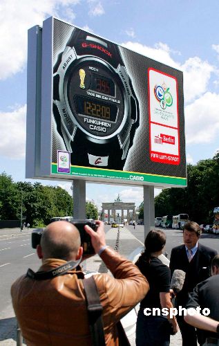 6月9日,在德國柏林街頭,2006世界杯倒計時牌與勃蘭登堡門遙相呼應(yīng),德國世界杯前一年倒計時活動已經(jīng)正式拉開帷幕。作者:Ic/cnsphoto