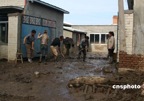 圖:洪水過(guò)后沙蘭鎮(zhèn)居民清理門前淤泥