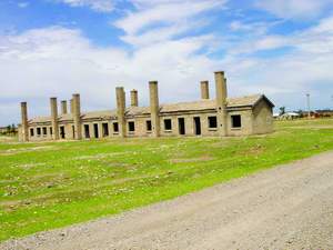大約距該鎮(zhèn)六七公里處,在公路西側(cè)有兩棟灰色的水泥磚砌成的平房,房子上面的煙囪很高,比平房高出兩三米,與中國的建筑迥然不同。每棟房10個(gè)房間,每個(gè)小間大約12平方米左右,爐子在房前,在外面生火。室內(nèi)已經(jīng)殘損不堪,地炕式的床鋪,上面是榻榻米,室內(nèi)用火墻取暖。