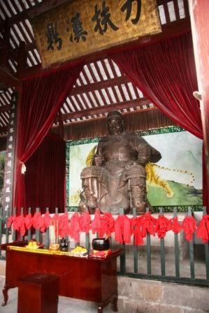 大殿銅像上面,懸掛了“力扶漢鼎”的牌匾。銅像前,游客多將紅布結(jié)系到銅像前的欄桿上,祈求平安。此間百姓將張將軍奉為神明,船夫漁民更是虔誠,張飛生日、逢年過節(jié)都要焚香供奉。傳說張飛在云陽幾次顯靈,除了那次讓張鵬翮膜拜,還有一次是明末張獻忠率大軍沿長江進軍四川,張飛一腳立江中,一腳立云陽縣城,不讓張獻忠入川。張飛在長江上便名聲大噪,成了保佑過往船只一路平安的神靈。