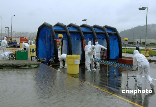 一刻鐘后,新支起的紅色帳篷下,治安警察指揮中心開始下達指令:“飛虎隊”進場控制匪徒;談判專家與匪徒對話解救“人質(zhì)”;消防防化隊伍建立防生化驗傷分類區(qū);衛(wèi)生部門設(shè)立護理區(qū)。司法警察局的緊急應變區(qū)高速運作。飛虎隊員以迅雷不及掩耳之勢制服匪徒、救出人質(zhì),現(xiàn)場觀眾得到有序疏散。