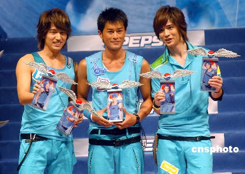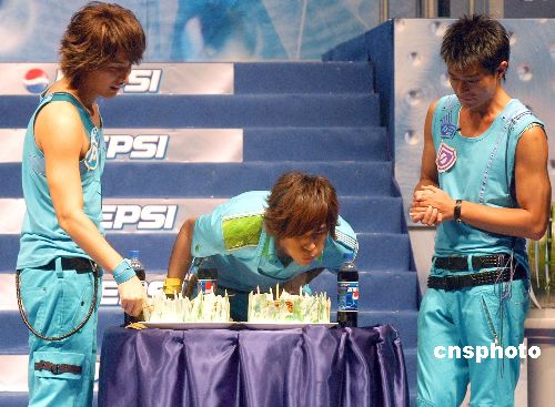 中新網(wǎng)6月17日電 據(jù)香港媒體報道,古天樂、言承旭(Jerry)及周渝民(仔仔),前晚一身藍色裝扮,出席《百事藍色風(fēng)暴615公告首部曲》記者會,吸引了五百歌迷捧場,場面熱鬧。由于仔仔上周四生日,古仔及Jerry特別送上蛋糕慶祝,Jerry更當(dāng)場飛擒咬吻仔仔。至于仔仔的生日愿望,則是身體健康、支持F4、古天樂及百事。