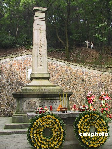 為紀(jì)念抗日戰(zhàn)爭勝利六十周年,曾是抗日戰(zhàn)場的風(fēng)景名勝地長沙岳麓山正在積極修繕陸軍第七十三軍抗戰(zhàn)陣亡將士公墓、清風(fēng)峽作戰(zhàn)指揮部、警察紀(jì)念堂、長沙會戰(zhàn)碑、陣亡將士名錄碑、古炮臺及戰(zhàn)壕遺址六處抗戰(zhàn)歷史遺跡,緬懷先烈。圖為由蔣介石題詞的陸軍第七十三軍抗戰(zhàn)陣亡將士公墓。作者:劉雙雙