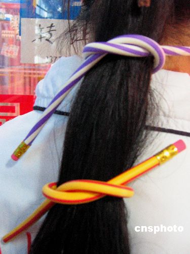6月19日,在南京一家時尚用品商店里,一款名為“百變不斷”的新型鉛筆十分引人注目。據(jù)介紹,這種新型鉛筆采用國外最新工藝制作,筆長約40厘米,筆芯使用效果相當于2B的普通鉛筆。該鉛筆即可實用,也可作為裝飾,柔度很高,可以隨意彎曲打結,還可扎在女孩的辮子上。作者:孫忠南