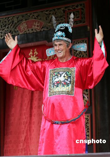 六月二十一日,前中國(guó)足球隊(duì)主教練米盧蒂諾維奇來(lái)到中國(guó)著名水鄉(xiāng)周莊參觀游覽,并穿起戲裝登臺(tái)做秀。作者:毛建軍
