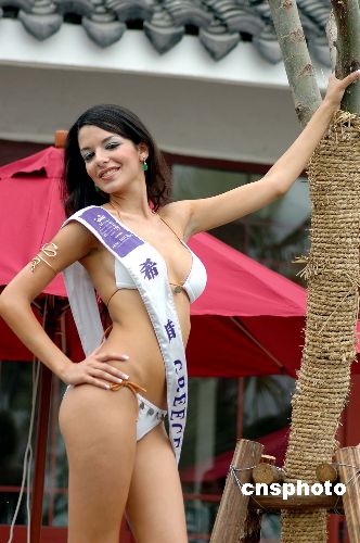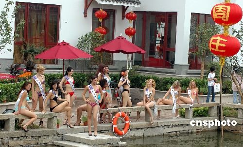 六月二十二日,參加國際旅游小姐最佳民族服裝冠軍大賽的七十五位佳麗在“中國第一水鄉(xiāng)”古鎮(zhèn)周莊奉獻了一場比基尼泳裝秀,盡情展示她們大膽、外向的美麗。作者:蔣振江