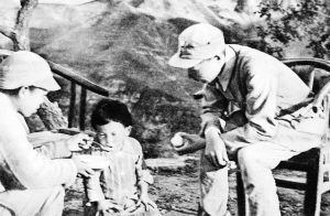 在一陣炮火之后,我與連長(zhǎng)韓金銘、四班長(zhǎng)和衛(wèi)生員小李沖進(jìn)山下的碉堡。這時(shí)里面還冒著硝煙,我們看到幾具日軍的尸體橫在地上,其中一具是日本婦女。使大家驚奇的是,在她的身邊有一個(gè)大約5歲左右的小姑娘木然地站在那里,用恐懼的目光呆呆地望著我們。大家斷定,這是敵人的家屬,是個(gè)無(wú)辜的孩子。這時(shí)車(chē)站的敵人還一個(gè)勁兒地向碉堡射擊。連長(zhǎng)馬上命令我:“快把這小孩護(hù)送到營(yíng)部的救護(hù)所去!”我抱起小姑娘,迅速地撤離了碉堡,沿交通壕往回返。