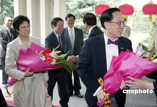 自動當(dāng)選并獲中央政府任命的香港特別行政區(qū)行政長官曾蔭權(quán)(右一)和夫人、前往機場迎接的國務(wù)院港澳辦副主任陳佐洱(左三),六月二十三日中午抵達北京釣魚臺國賓館。曾蔭權(quán)將于二十四日參加在人民大會堂舉行的宣誓就職儀式。作者:盛佳鵬