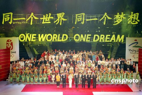 夜晚的北京沉浸在節(jié)日的喜慶氣氛里。20時15分,在全場來賓的熱切期盼中,李長春宣布北京2008年奧運會主題口號:“同一個世界同一個夢想”。