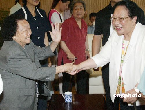 六月二十六日,為紀(jì)念中國(guó)工農(nóng)紅軍長(zhǎng)征勝利七十周年和中國(guó)人民抗日戰(zhàn)爭(zhēng)勝利六十周年,曾參加過戰(zhàn)爭(zhēng)的老紅軍、新四軍、八路軍匯聚在北京解放軍歌劇院,參加在這里舉行的“血染的豐碑”紀(jì)念活動(dòng)。圖為老紅軍王定國(guó)(左)和王新榮出席紀(jì)念活動(dòng)。作者:錢興強(qiáng)