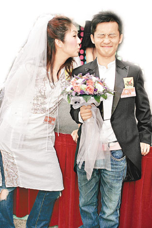 中新網(wǎng)6月28日電 據(jù)香港媒體報(bào)道,楊千嬅和林一峰昨日到銅鑼灣,出席《拉闊音樂(lè)會(huì)》的露天記者會(huì),兩人以新郎新娘造型出現(xiàn)扮結(jié)婚,他們更即場(chǎng)作狀簽字和交換戒指,但簽字時(shí)突然下雨,搞到兩人十分狼狽,千嬅笑言連老天都反對(duì)兩人結(jié)婚,當(dāng)千嬅讀誓詞時(shí)又忍不住笑,最后她把花球拋給林一峰。