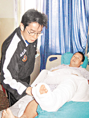 “香港明星足球隊(duì)”前日與“中國明星足球隊(duì)”于北京進(jìn)行友誼賽,結(jié)果落敗之余,志偉及張兆輝更受傷收場,志偉被對方隊(duì)員踢中左腳,痛得未能站起來,最后要用擔(dān)架抬離現(xiàn)場,隨即送院治理,經(jīng)醫(yī)生診斷后需馬上進(jìn)行手術(shù),幸好一切順利,據(jù)其主診醫(yī)生透露,志偉傷勢并不嚴(yán)重,大約休息七天,待完全康復(fù)后更可繼續(xù)踢球。