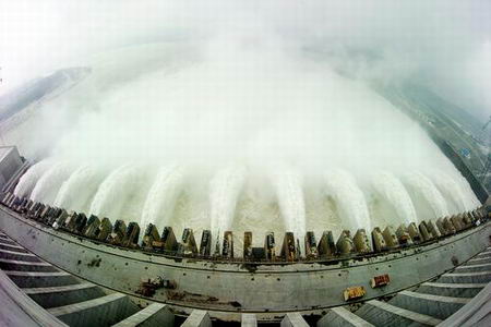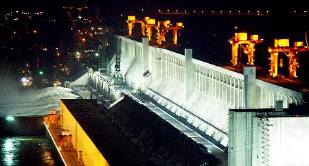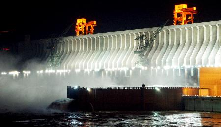 夜幕下的大壩比白天更加?jì)趁,五彩燈火在四面八方輝映烘托,10余道白浪從壩身中部90平臺(tái)的10余個(gè)泄洪深孔中噴薄而出,在一片彩色射燈中幻化成10余條怒吼的飛龍!