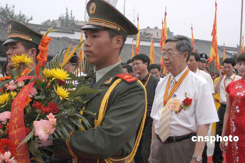 在古樂(lè)和廟內(nèi)古箏的伴奏下,參祭隊(duì)伍按順序列隊(duì),由禮儀人員引導(dǎo),全國(guó)人大常委會(huì)副委員長(zhǎng)許嘉璐,澳門(mén)基金會(huì)行政委員吳志良、臺(tái)灣時(shí)報(bào)周刊名譽(yù)董事長(zhǎng)簡(jiǎn)志信等參祭人士,在兩位武警禮兵的協(xié)助下,進(jìn)入廟內(nèi)敬獻(xiàn)花籃、行禮。
