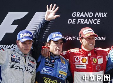 7月3日雷諾車隊(duì)的西班牙車手阿隆索(中)、法拉利車隊(duì)的德國(guó)車手舒馬赫(右)、與邁凱輪車手萊科寧在法國(guó)Grand Prix賽車Magny-Cours跑道上進(jìn)行比賽。雷諾車隊(duì)阿隆索贏得了這場(chǎng)比賽。