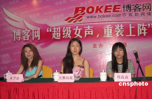 七月五日,由博客網(wǎng)主辦的“超級(jí)女聲重裝上陣”活動(dòng)新聞發(fā)布會(huì)在北京舉行。備受中國內(nèi)地網(wǎng)民關(guān)注的歌手韓真真(圖右1)全程代言此次比賽!熬W(wǎng)絡(luò)紅人”木子美、芙蓉姐姐、流氓燕、竹影青瞳等作為嘉賓進(jìn)行全程賽況點(diǎn)評(píng)。