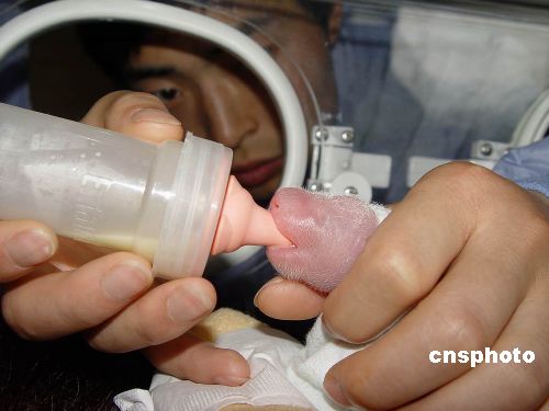 大熊貓“英英”生產持續(xù)時間長達十三個小時?蒲腥藛T根據大熊貓媽媽只負責養(yǎng)育多胞胎中的一仔的習性,已把握時機成功從母親“英英”身邊取走其中一仔人工養(yǎng)育,并擇時與另一仔進行換養(yǎng)。