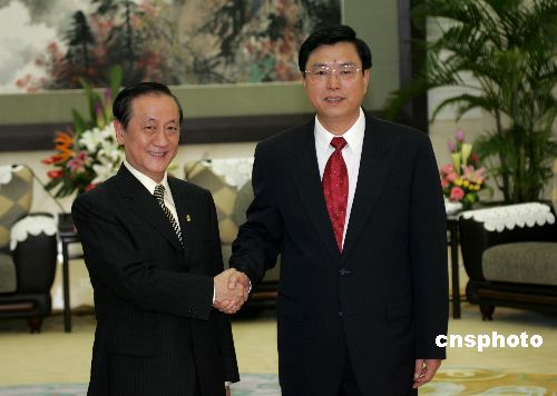 中共中央政治局委員、中共廣東省委書記張德江七月六日在廣州會(huì)見由新黨主席郁慕明率領(lǐng)的臺(tái)灣“新黨紀(jì)念抗戰(zhàn)勝利六十周年大陸訪問團(tuán)”。作者:毛建軍