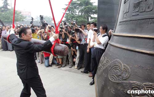 臺灣新黨主席郁慕明率領的臺灣新黨“民族之旅”訪問團七月八日在南京參觀侵華日軍南京大屠殺遇難同胞紀念館時敲響和平大鐘。作者:毛建軍