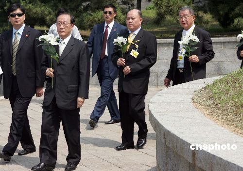 新黨主席郁慕明率領(lǐng)的臺(tái)灣新黨“民族之旅”訪問(wèn)團(tuán)七月九日在大連向旅順萬(wàn)忠墓敬獻(xiàn)花圈。萬(wàn)忠墓是中日甲午戰(zhàn)爭(zhēng)旅順殉難同胞的墓地。一八九四年十一月二十一日,日軍侵入旅順市區(qū),滅絕人性地進(jìn)行了四天三夜大屠殺,我近兩萬(wàn)同胞慘遭殺害,遇難者尸體被集體焚燒后叢葬于此。作者:毛建軍