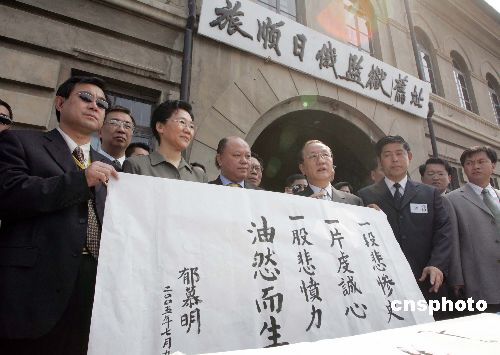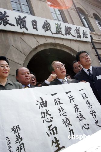 新黨主席郁慕明率領(lǐng)的臺(tái)灣新黨“民族之旅”訪(fǎng)問(wèn)團(tuán)七月九日在大連參觀旅順日俄監(jiān)獄舊址,并題字“一段悲慘史,一片虔誠(chéng)心,一股悲憤力,油然而生”。作者:毛建軍