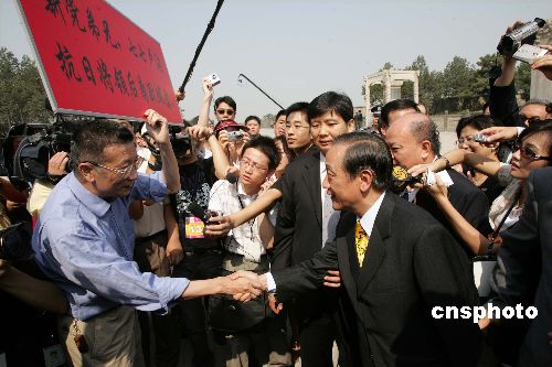 臺灣新黨“民族之旅”訪問團(tuán)七月十一日在北京參觀盧溝橋時,新黨主席郁慕明與歡迎他的民眾握手交談。作者:毛建軍