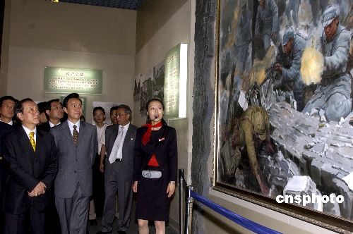 隨后郁慕明一行來(lái)到位于宛平城北側(cè)的“中國(guó)人民抗日戰(zhàn)爭(zhēng)紀(jì)念館”。在序廳里,郁慕明向抗日英烈們敬獻(xiàn)了花圈,并默哀致敬。隨后,訪問(wèn)團(tuán)參觀了“偉大勝利——紀(jì)念中國(guó)人民抗日戰(zhàn)爭(zhēng)暨世界反法西斯戰(zhàn)爭(zhēng)勝利六十周年大型主題展覽”。展覽分民族危急救亡興起、國(guó)共合作共赴國(guó)難、中流砥柱抗戰(zhàn)燈塔等八個(gè)部分。記者注意到,郁慕明在國(guó)共合作共赴國(guó)難以及臺(tái)港澳同胞抗日部分逗留時(shí)間最長(zhǎng)。