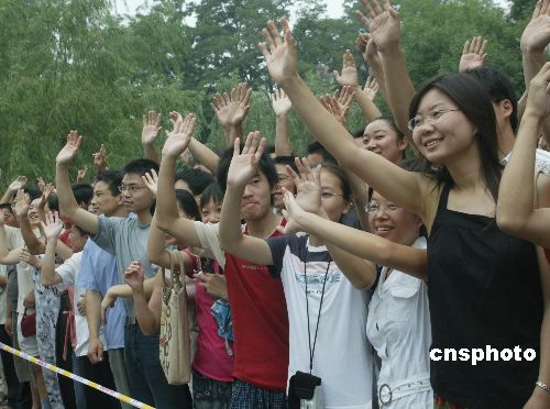 中國人民大學(xué)師生們在校園歡迎臺灣新黨主席郁慕明率領(lǐng)的大陸訪問團來訪。作者:史利