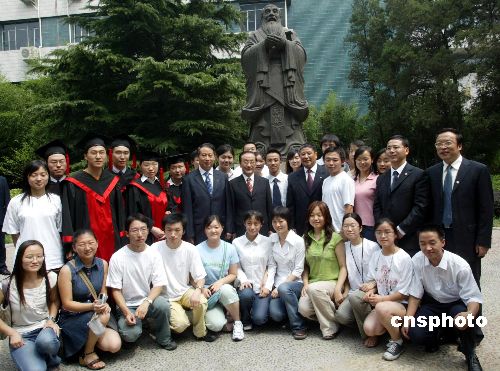新黨主席郁慕明一行與中國人民大學(xué)學(xué)生們在孔子像前合影。作者:史利