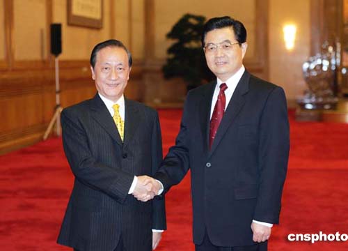 中新網(wǎng)北京7月12日電(記者邢利宇)自人民大會堂現(xiàn)場報道:今天下午三時許,中共中央總書記胡錦濤在人民大會堂會見了由新黨主席郁慕明率領(lǐng)的新黨紀(jì)念抗戰(zhàn)勝利六十周年大陸訪問團(tuán)。(完)