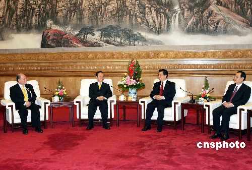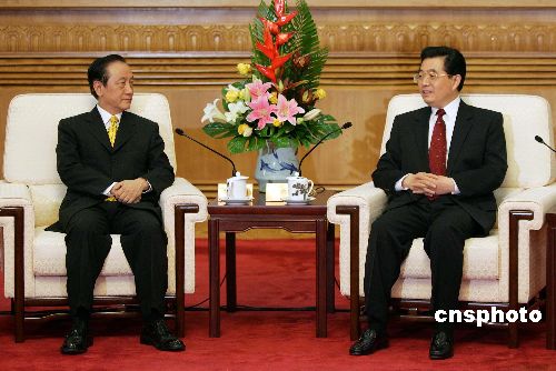 中共中央總書(shū)記胡錦濤七月十二日在北京人民大會(huì)堂會(huì)見(jiàn)臺(tái)灣新黨主席郁慕明率領(lǐng)的臺(tái)灣新黨“民族之旅”訪問(wèn)團(tuán)。作者:毛建軍