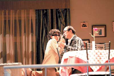 陶虹在全場(chǎng)最“正!钡拇虬绫闶堑谌齻(gè)中年婦女的角色,一頭規(guī)矩的黑發(fā),身穿土黃色的、式樣頗為土氣的套裙,手中拎的白色皮包也是極盡規(guī)矩。從首演效果來看,陶虹的三次“變身”還算成功,三個(gè)反差極大的人物造型給她的表演助了一臂之力。