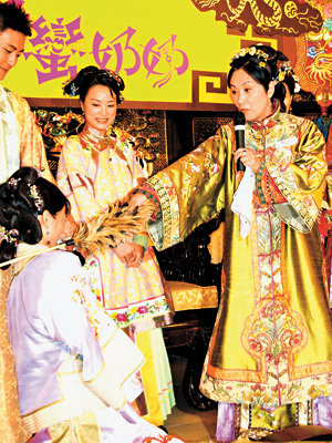中新網(wǎng)7月13日電 據(jù)香港《大公報》報道,“無線”將于下周一推出新劇《我的野蠻奶奶》,昨日一班演員包括汪明荃、胡杏兒、黃宗澤及伍詠薇等,特地穿上清裝到珍寶海鮮舫舉行“新抱入門儀式”宣傳活動。期間“阿姐”、杏兒及Bosco(黃宗澤)除了Rap唱主題曲之外,“阿姐”更如野蠻奶奶“上身”般,向杏兒訓(xùn)示媳婦入門家規(guī)時喝令她跪下,之后送杏兒繡花鞋、樹葉及雞毛掃,“阿姐”道:“送樹葉是希望你開枝散葉,我看你晚晚都沒空!倍觾阂膊皇呛闷圬,斟茶時即對“阿姐”道:“小心嗆到!”